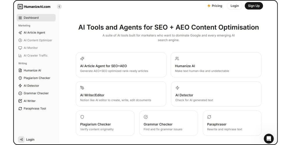 Its signature AI Humanizer tool achieves one of the highest detection-bypass accuracies in 2025, converting robotic AI text into authentic, human-sounding writing. Alongside that, the AI Article Agent crafts optimized articles ready for Google AI Overviews, ChatGPT, Gemini, Bing Copilot, and Perplexity visibility.